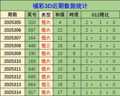 类型分析:上期开出中奖号是917,开出组六类型,最近十期开出组六类型奖8期,分别开出310、697、164、190、169、640、689、917。开出组三类型2期,开出448、664,综合分析,本期预测开出组六号码机率较大。