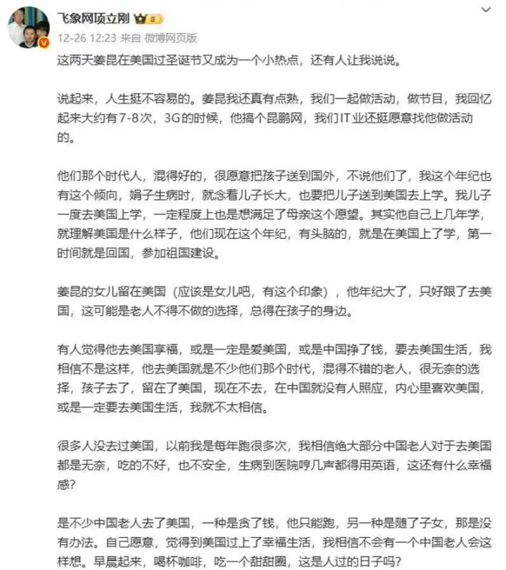 一方坚守着朴素的爱国情感底线,认为像姜昆这样的国家级文化符号,其生活轨迹应当与本土保持绝对的一致性,任何与“西方生活方式”的过度沾染都是一种某种程度上的“背离”。