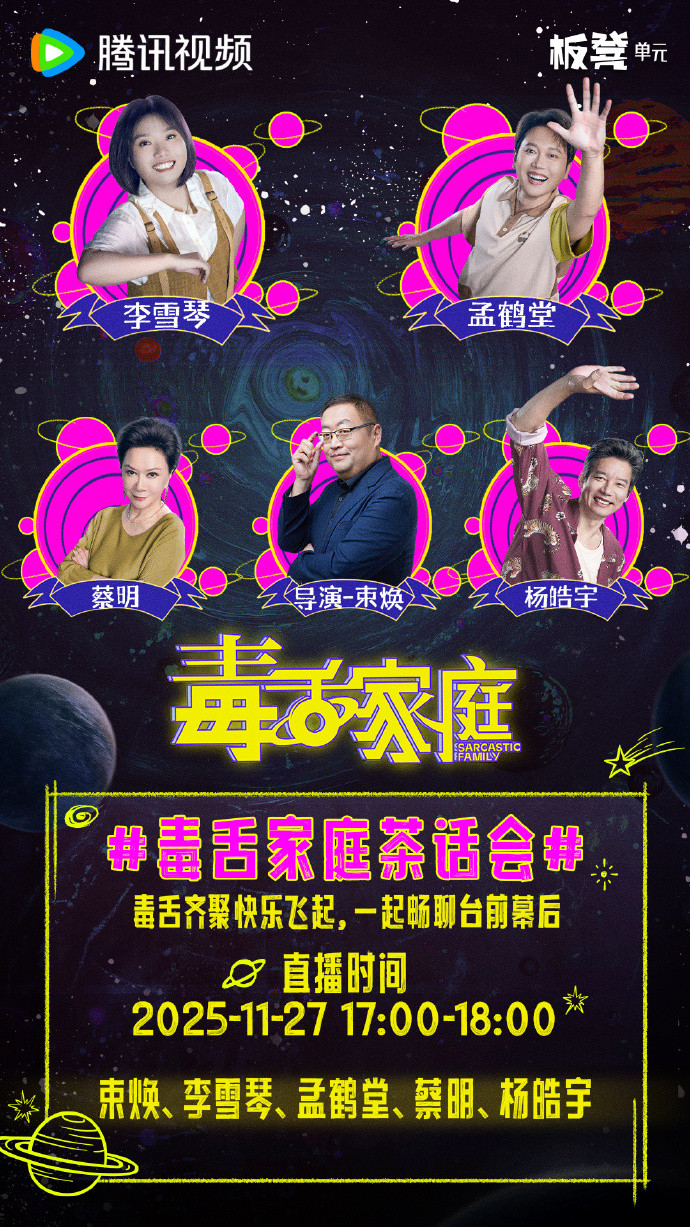 导演@束焕 携手「毒舌」一家人李莉黎@我是李雪琴啊 孟航@孟鹤堂 蔡晓莺@蔡明 孟谦万@杨皓宇 在线畅聊家庭趣事。