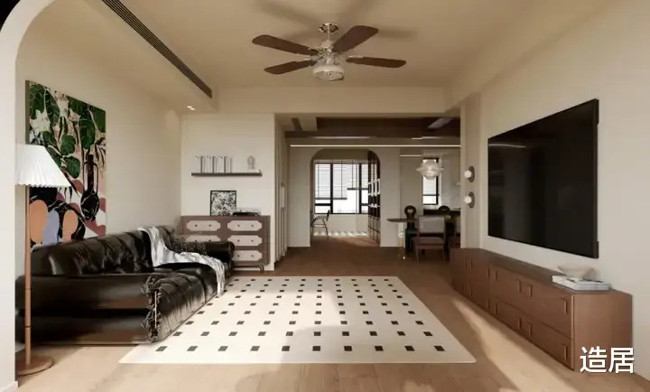 别盲目前移常规户型沙发前移后,背后至少保留 30cm 的通行宽度,客厅面宽小于 3.5 米不建议做复杂柜体。