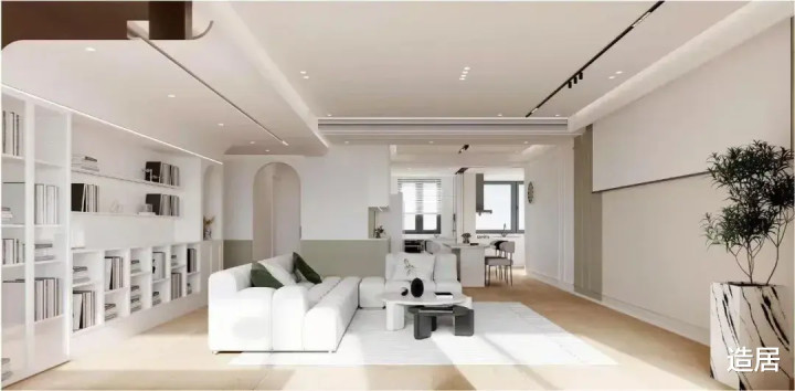 如果客厅和书房、休闲区相连,不用完全打通墙面,只做半墙隔断,沙发背靠半墙摆放,就是当下最火的半开放式布局。