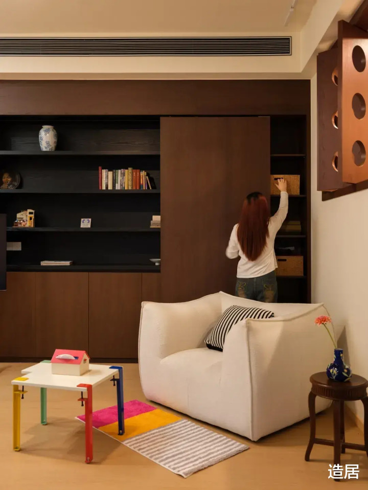 家里有孩子需要辅导作业,这个布局再合适不过。沙发背后定制一张超长书桌,家长坐在沙发上,就能随时照看书桌前写作业的孩子,不用在客厅和书房之间来回跑,兼顾家务和育儿。