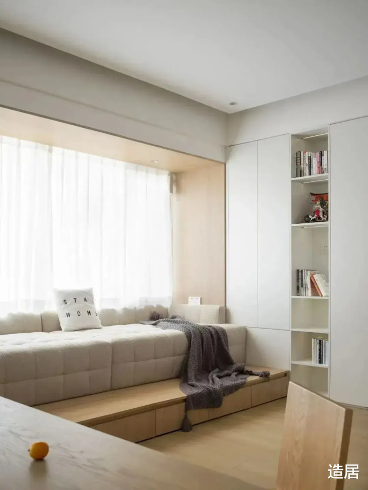 02、沙发靠墙,整面墙都能做收纳,解决家里杂物多的问题;
