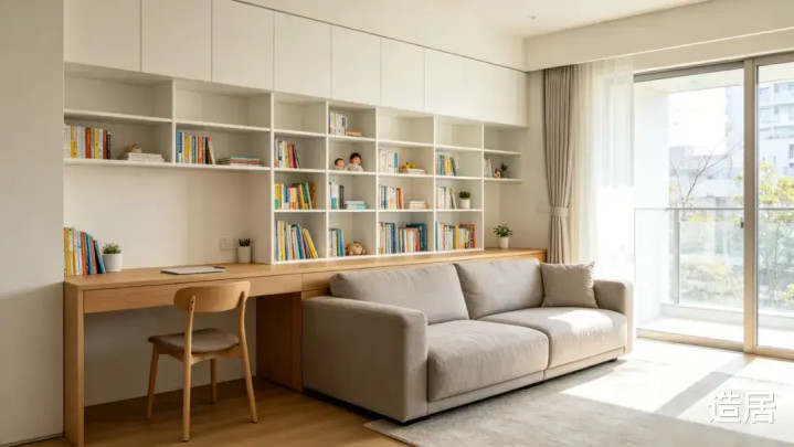 书桌旁搭配开放式书架,随手拿取书籍,让客厅秒变开放式书房,亲子互动、居家办公、阅读学习都能满足。