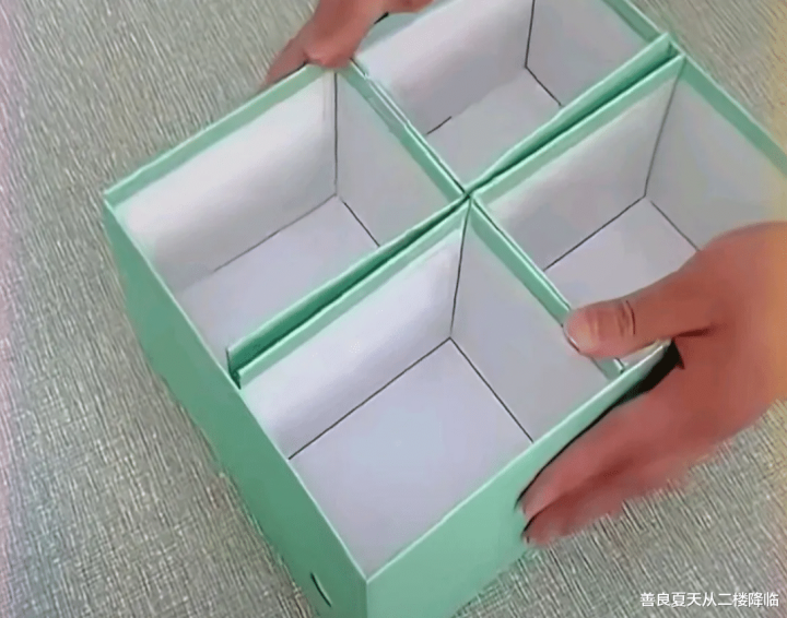 有天闺女翻鞋盒玩,拿美工刀在盖子上划了个十字,掰开后四个角翘起来。我灵机一动,把盖子倒扣进盒身,正好隔出四个格子——放她的发卡、皮筋、小贴纸再合适不过。